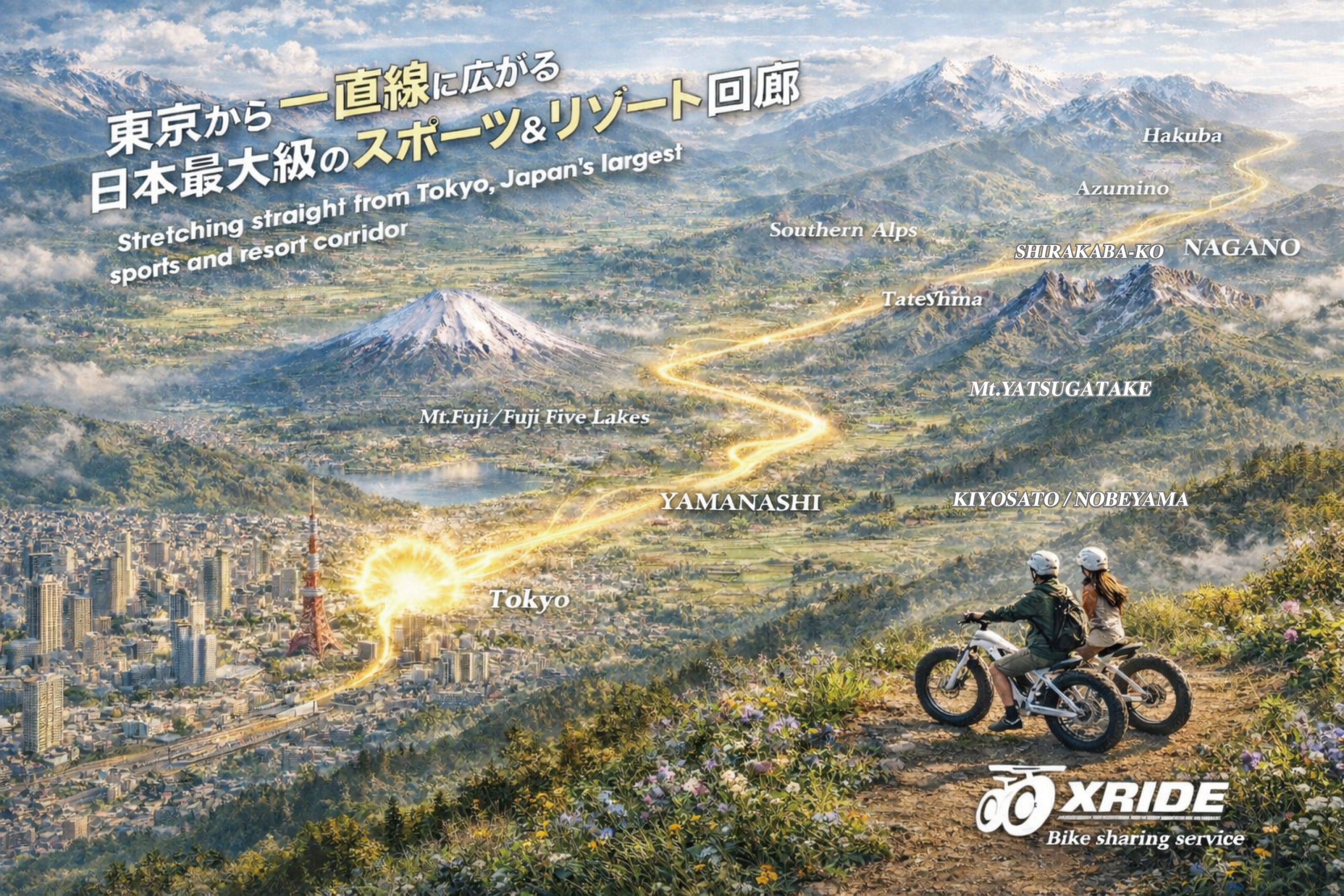 東京から山梨、そして長野へと連なるエリアには、富士山、八ヶ岳、南アルプス、北アルプスといった日本を代表する山岳資源が集積しています。都市から数時間圏内に、世界的にも希少なスケールの自然環境が存在するこの地理的特性を、XRIDE は「山岳リゾート回廊」として再定義しています。